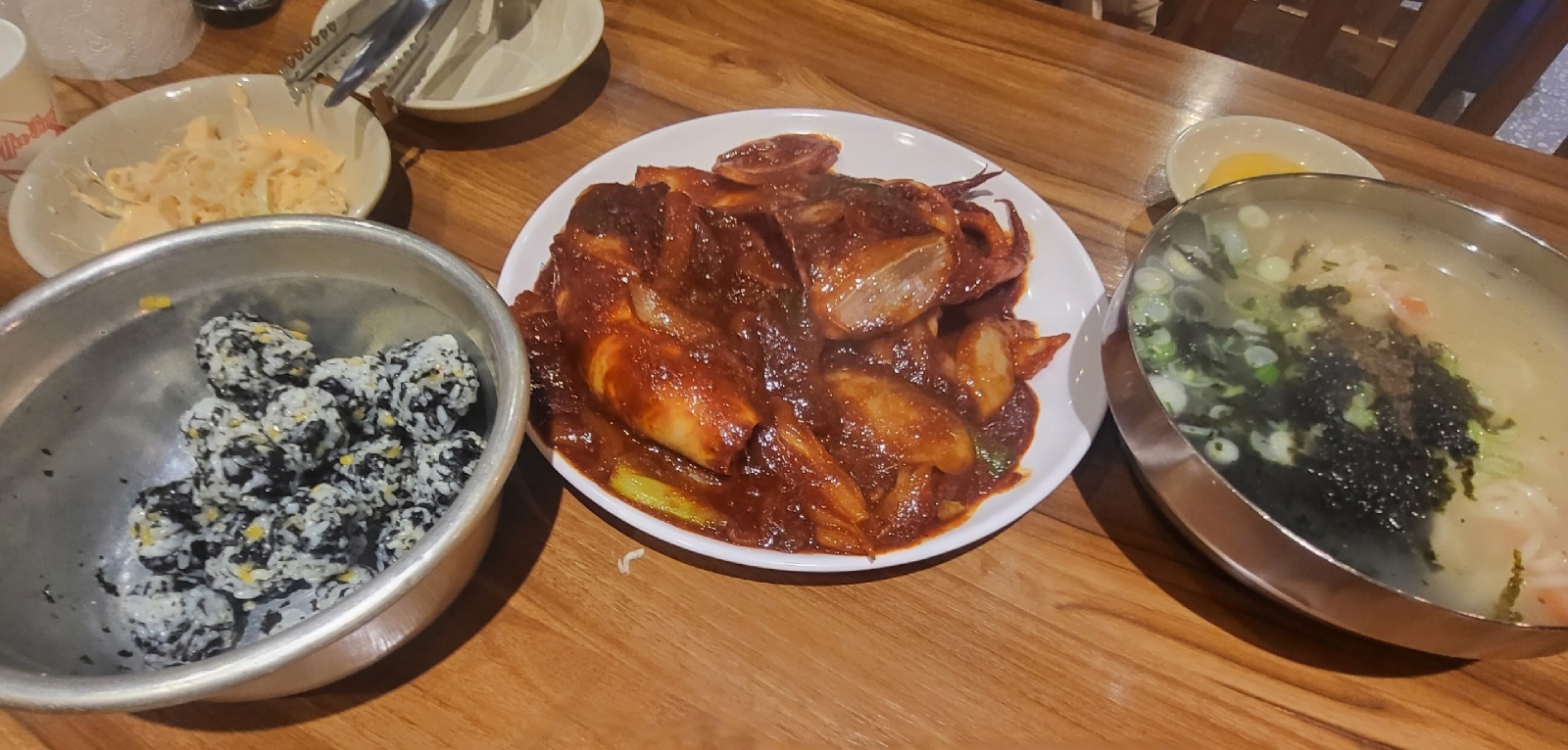 기본으로 매운 오징어와 칼국수 그리고 주먹밥을 주문합니다. 매운 오징어 양념에 비벼 먹는 주먹밥과 칼국수 면은 정말 포스팅을 하는 지금도 짜릿한 매운 느낌과 동시에 입가에 군침을 돌게 하네요. 이 맛은 정말 드셔보셔야 합니다. 매운맛 좋아하시는 분들에게는 필수 추천 메뉴입니다.