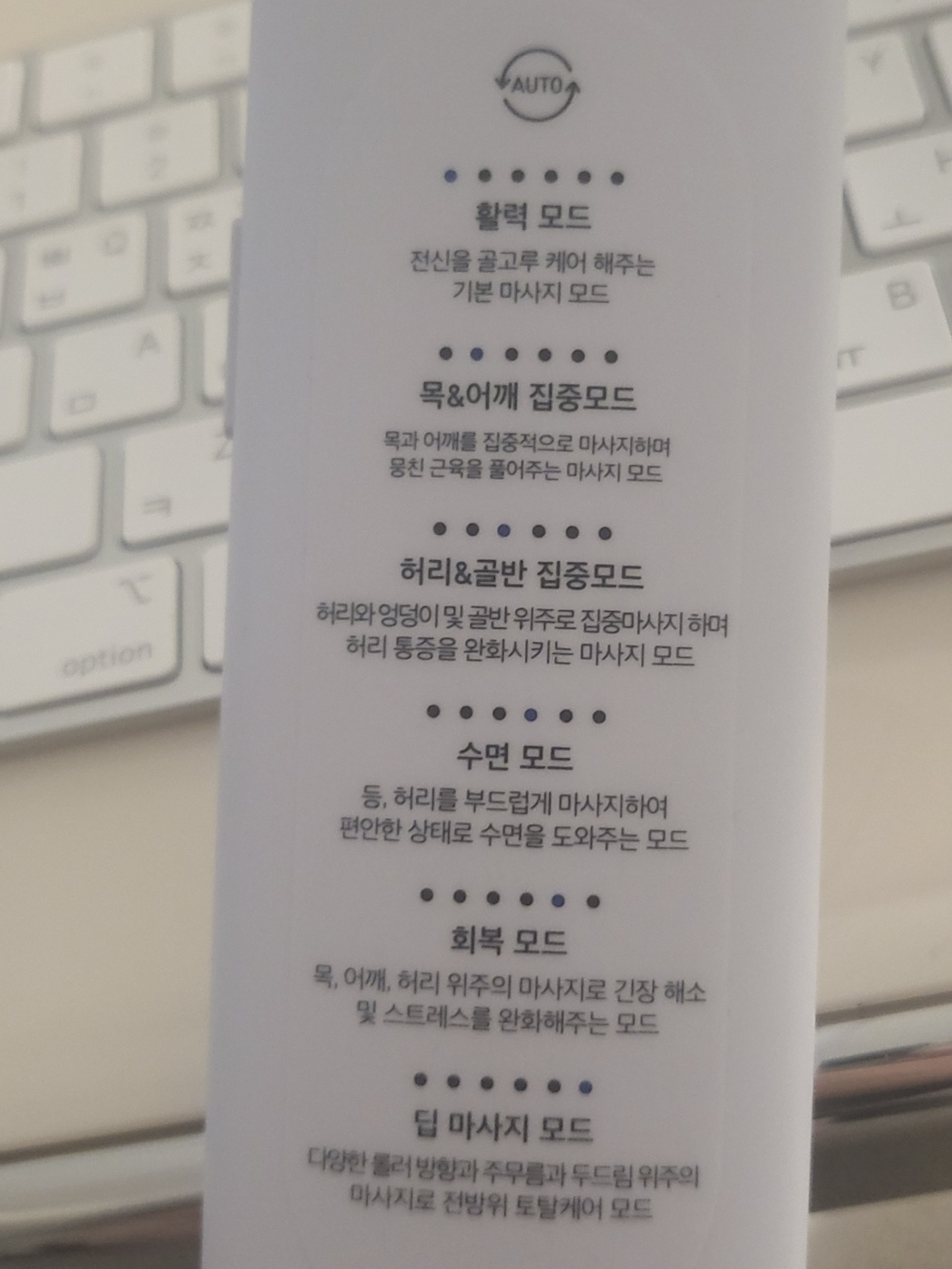 - 회복모드:목, 어깨, 허리 위주의 마사지로 긴장 해소 및 스트레스를 완화해 주는 모드