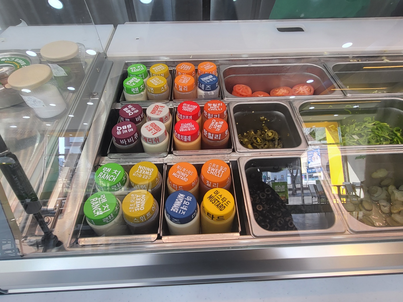 메뉴선택과 빵 선택, 크기, 각종 야채류 중 원치 않는 종류가 있는지 점원이 확인합니다. 마음에 드는 소스까지 고르면